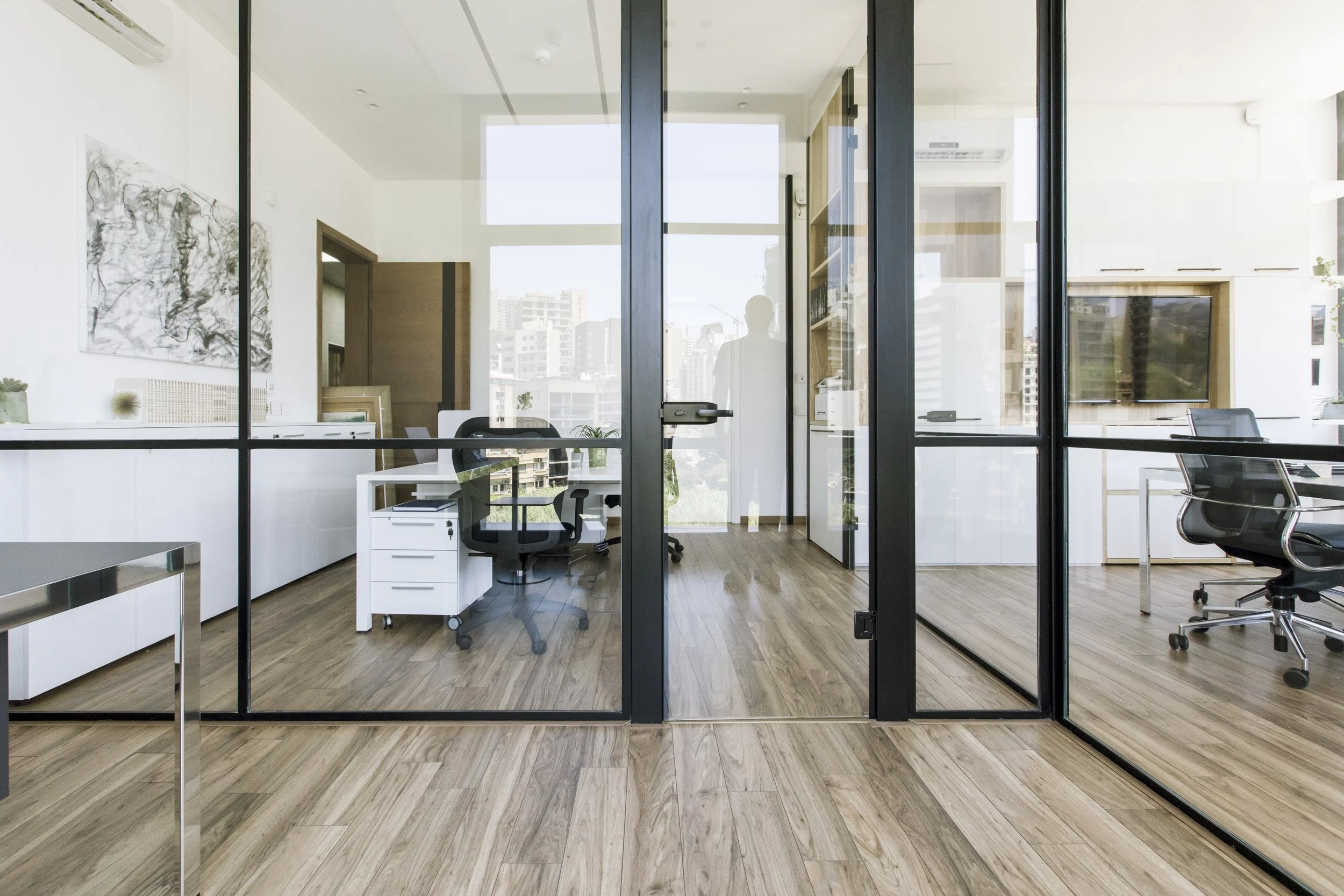 The challenge was to keep the space open and breathable while having to house multiple functions in a relatively small area. The office is thus partitioned by glass walls lined with black mullions that are inspired by the existing windows. All other finishes and furniture lie in a neutral color scheme. Light natural grain wood finishes are contrasted with crisp white planes and stark black-trim glazing, to create an animated yet harmonious light-washed space that optimizes openness, privacy, connectedness and workflow.