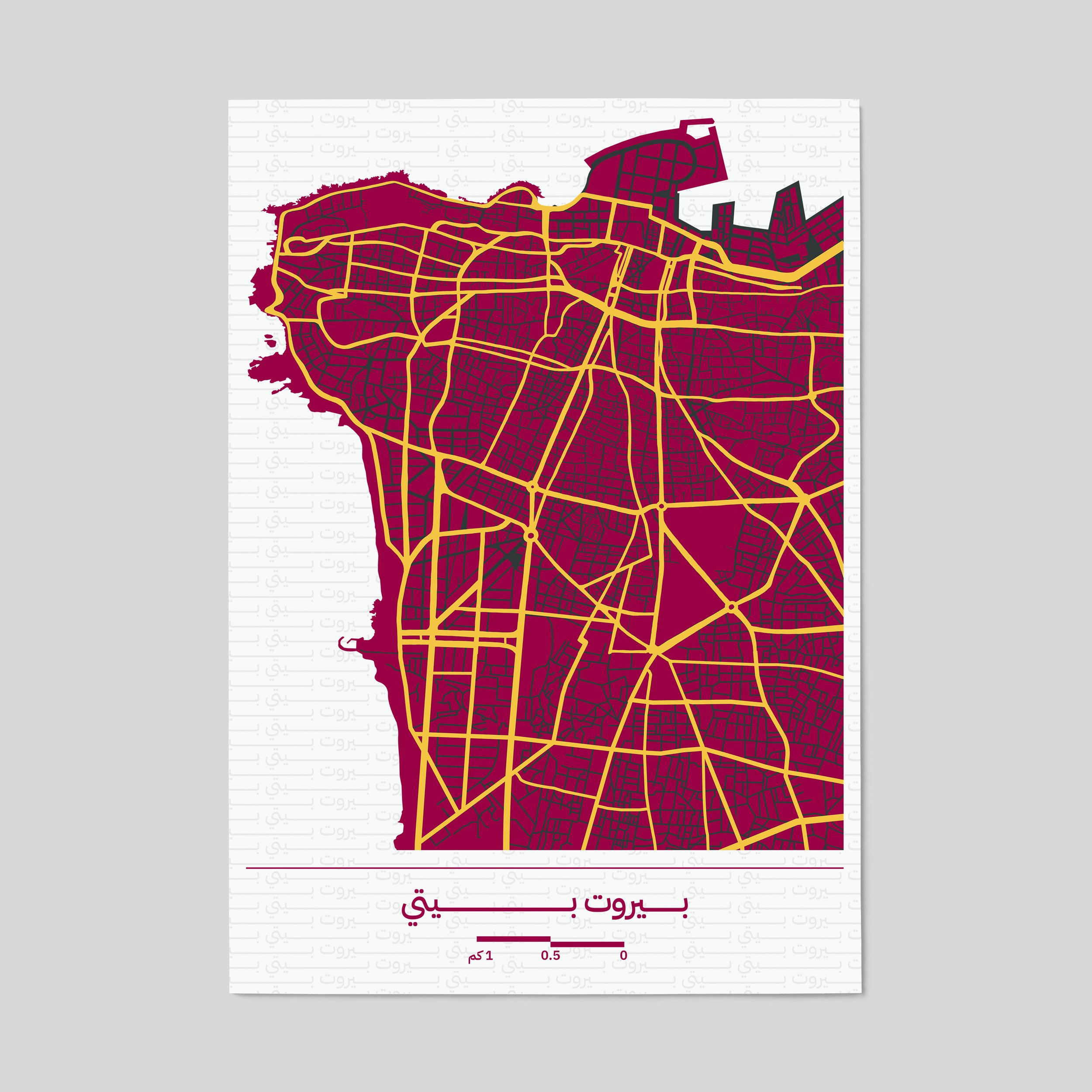 Beirut Beiti [Beirut, my home], is a series of maps of Beirut. I’ve designed the map in three bright color schemes: Bold Batinjen [bold eggplant], Deep Debs el Remmen [deep pomegranate molasses] and Leil Lebnen [night of Lebanon]