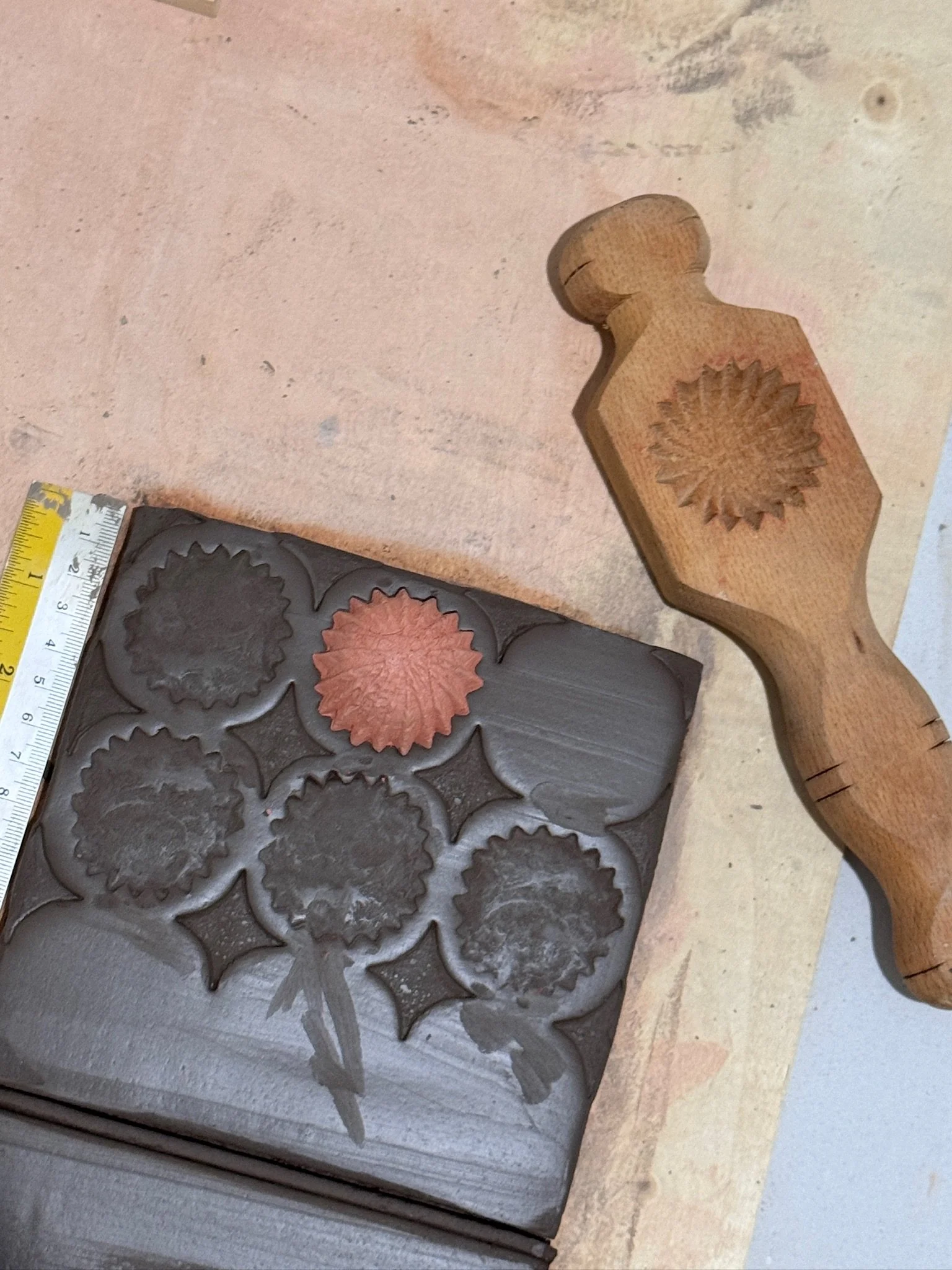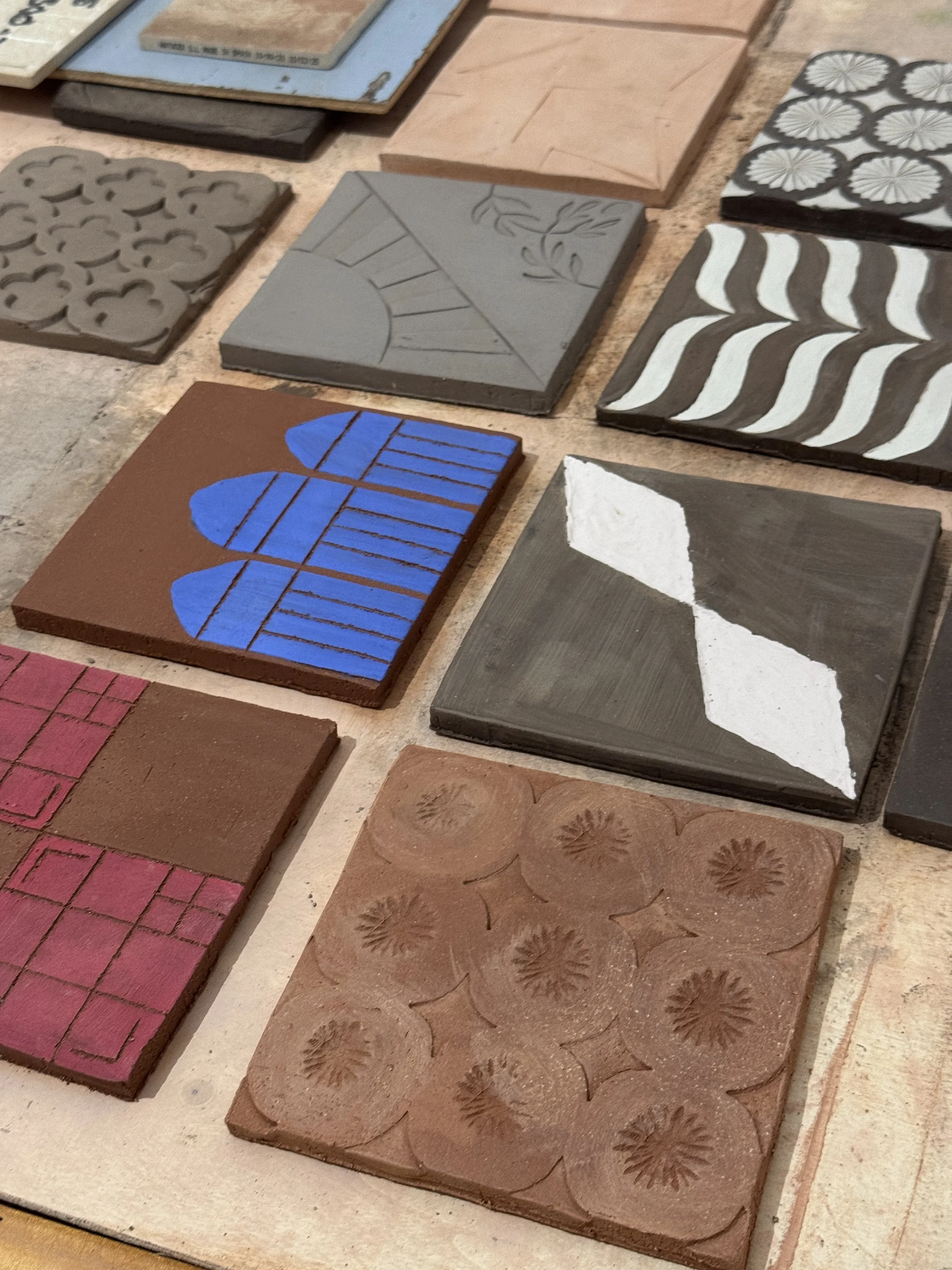 Through this body of work, we began introducing layered marks and reliefs that give the collection a deeply tactile, three-dimensional quality. We experimented with objects gathered from our families and homes, like tools, textiles, and fragments of everyday life - pressing them into clay to create patterns that carry traces of personal and collective memory. Alongside this, we carved our own stamps from lino sheets and clay, and also created 3D printed stamps.